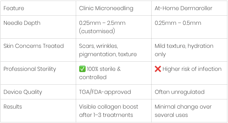 Modern microneedling devices used in clinics (such as Dermapen or SkinPen) offer precise depth control and faster healing compared to DIY rollers, ensuring maximum safety and results.