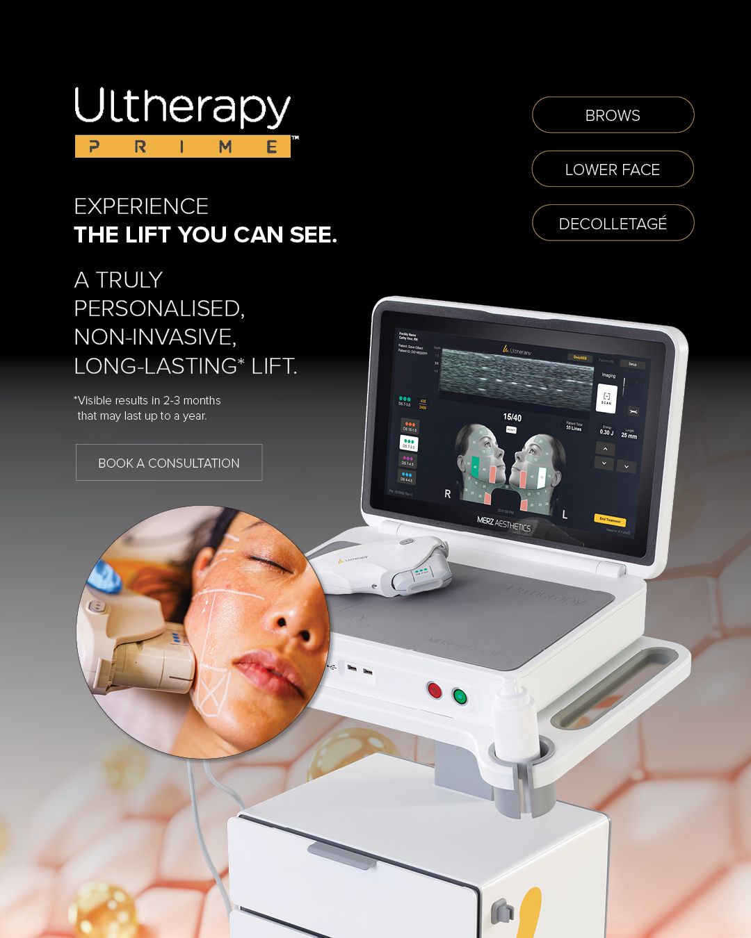 See proven results with Ultherapy PRIME, FDA-cleared for non-invasive lifting of the brow, chin, neck, and improvement of lines and wrinkles on the décolleté.*3 Personalize each treatment to your patient's unique needs in one session with zero downtime to create a sustained lift for all skin types that lasts a year or more.